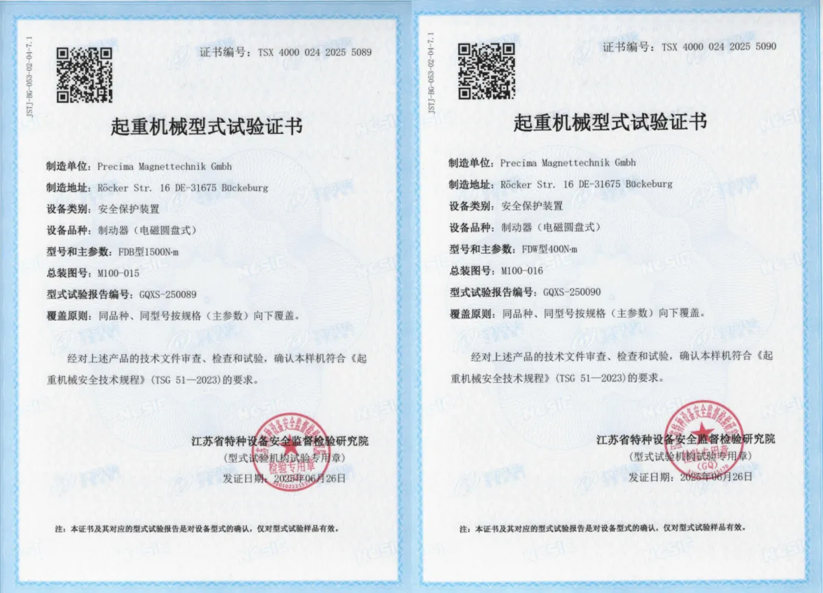 Unsere Bremsentypen FDB und FDW haben sich erfolgreich der TSG-Typprüfung gemäß TSG 51-2023 gestellt. Diese Zertifizierung basiert auf den chinesischen Sicherheitsvorschriften für sogenannte „Sonderausrüstungen“ und definiert die technischen Anforderungen für Konstruktion, Herstellung, Installation, Modifikation, Wartung und Prüfung von Krananlagen in China.